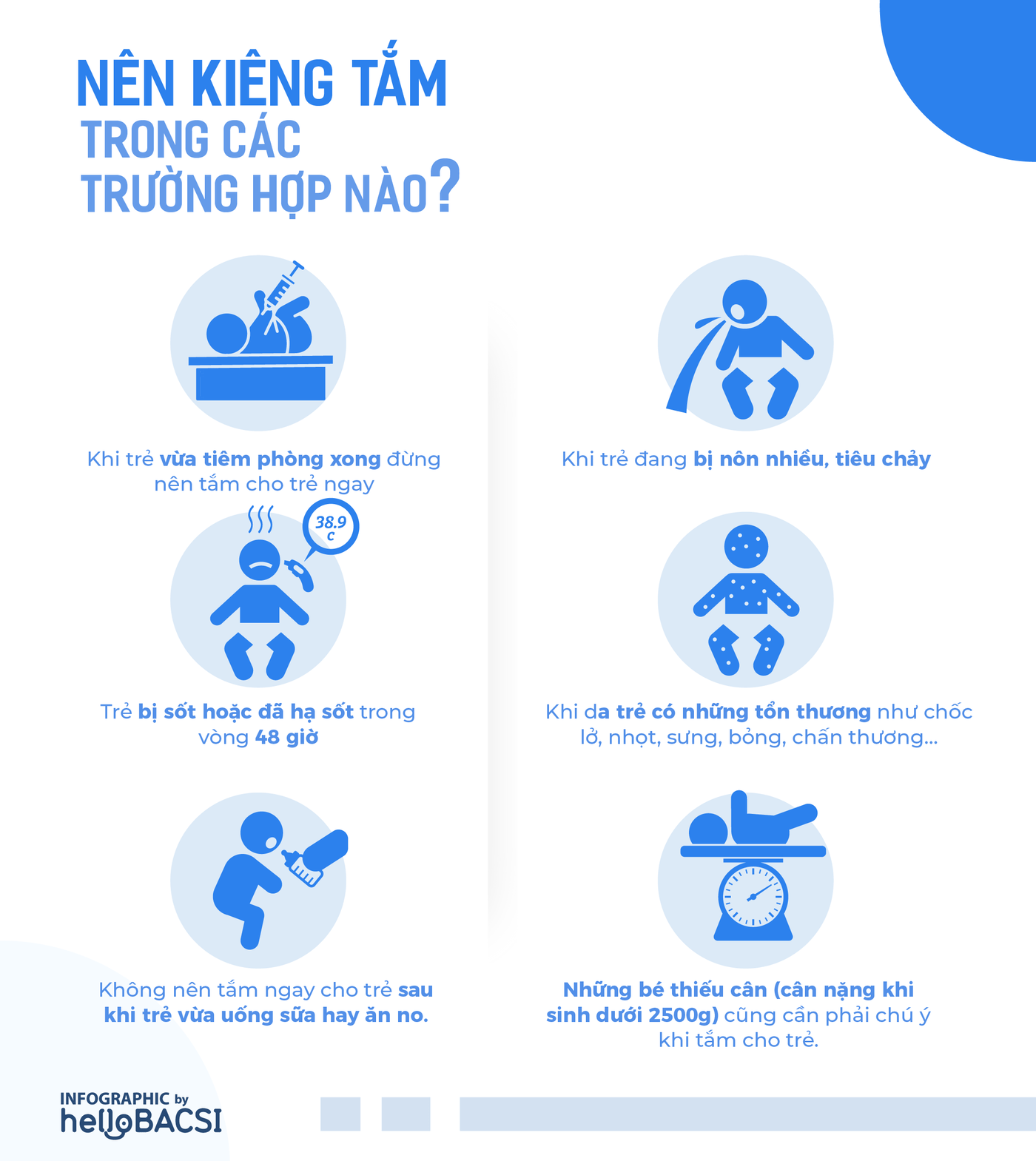 Việc không tắm gội cho trẻ là một trong những sai lầm khi chăm sóc trẻ sơ sinh. Việc kiêng tắm cho trẻ sơ sinh không thực sự giúp trẻ tránh được các vấn đề sức khỏe nêu trên, mà còn làm cho trẻ dễ mắc các bệnh nhiễm trùng ngoài da, vì giai đoạn này kháng thể của bé còn non yếu.