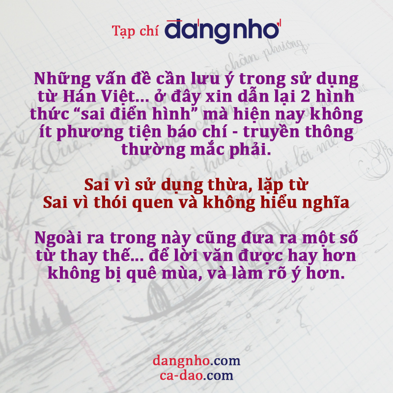 Đã có nhiều công trình nghiên cứu của các chuyên gia ngôn ngữ học về lịch sử, tính tiếp biến, những vấn đề cần lưu ý trong sử dụng từ Hán Việt… ở đây xin dẫn lại 2 hình thức “sai điển hình” mà hiện nay không ít phương tiện báo chí – truyền thông thường mắc phải.
