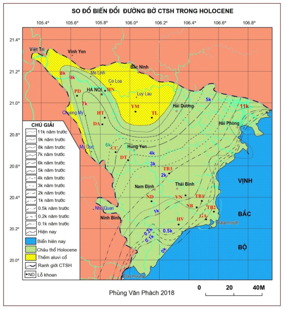 Bản đồ thể hiện mực nước biển trong đồng bằng sông Hồng theo nghiên cứu năm 2018 của nhóm Phùng Văn Phách, chúng ta có thể thấy được thời Phùng Nguyên thì đồng bằng sông Hồng mới mở ra tới Hưng Yên. [5]
